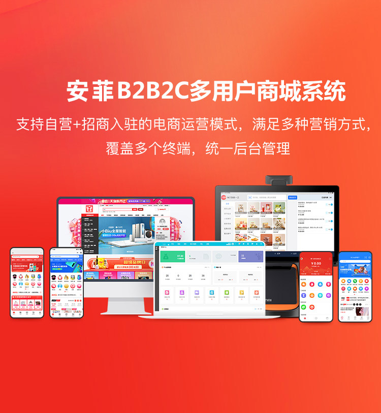 支持自营+招商入驻的电商运营模式,满足多种营销方式,覆盖多个终端,统一后台管理。