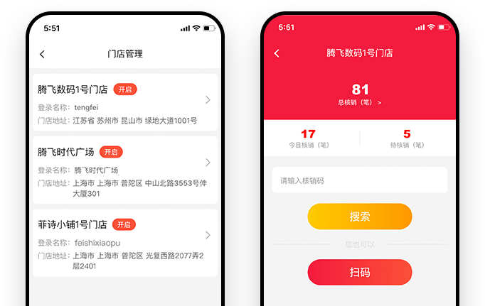 拥有多个门店的商家,可以在后台添加门店信息,当消费者在线上购物选择门店自提时,商家则可以通过安菲科技掌柜进入对应的门店进行门店扫码核销,为消费者完成提货