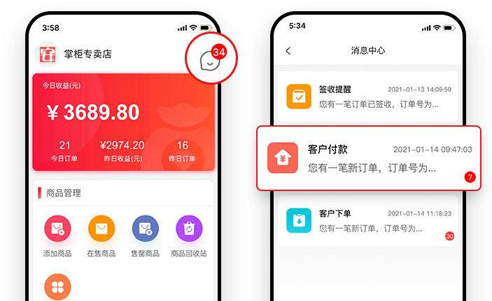 商家随时通过手机收到店铺订单信息,便于及时处理