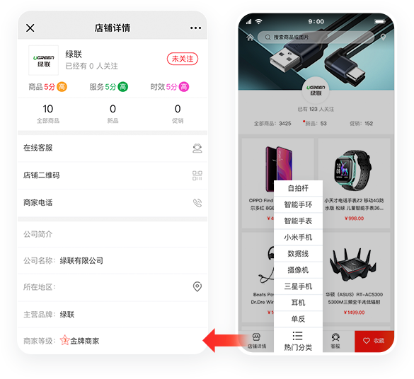 商家的独立店铺,在混合APP上面的展现更具个性化,简约的同时,通过点击菜单,可以看到商家更晚站的信息